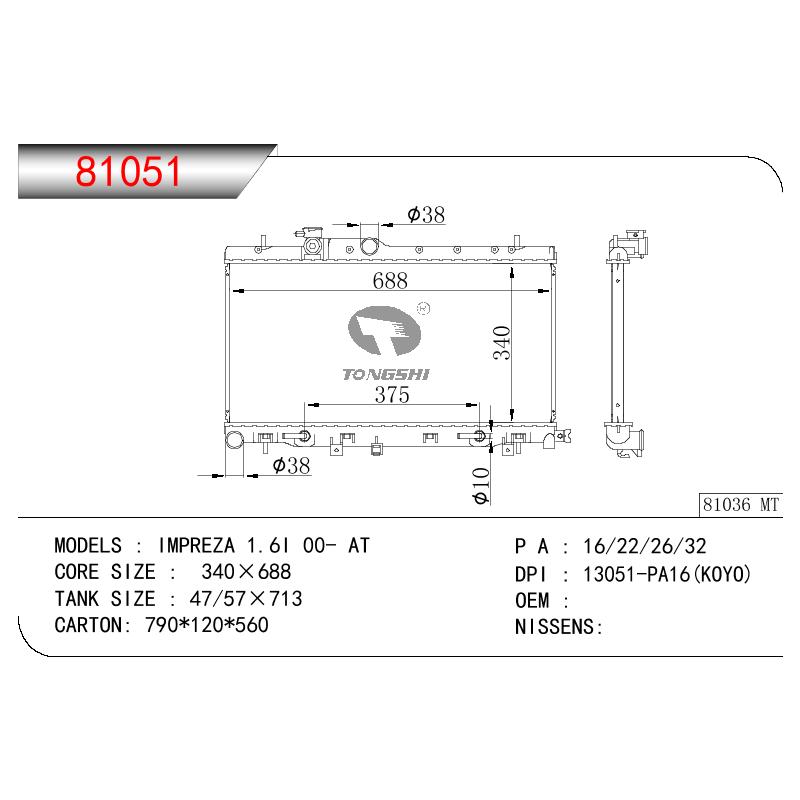 适用于斯巴鲁翼豹 1.6I 00- AT散热器 OEM:13051-PA16(K0Y0)