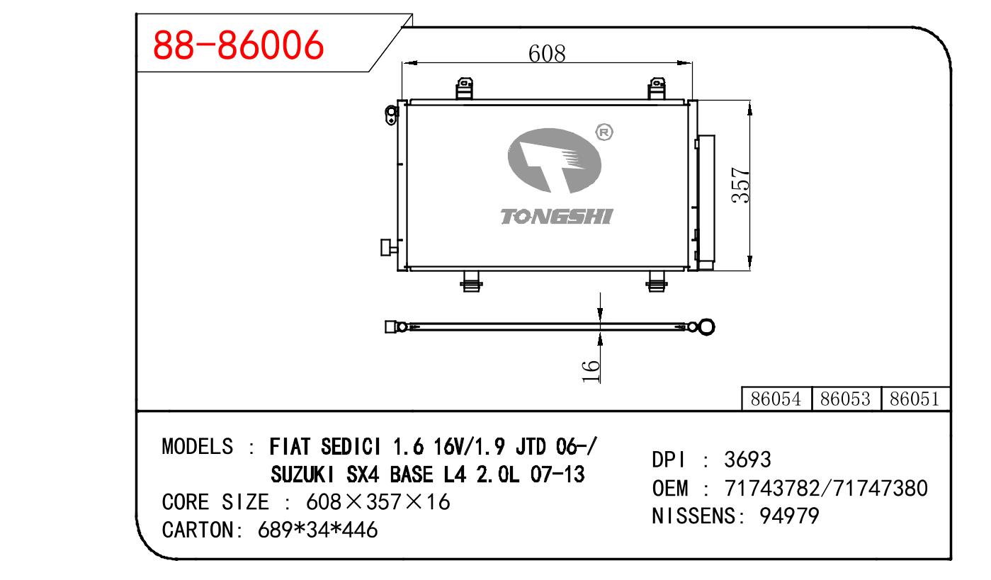 - 适用于菲亚特 SEDICI 1.6 16V/1.9 JTD 06-/铃木 SX4 BASE L4 2.0L 07-13冷凝器 OEM : 71743782/71747380