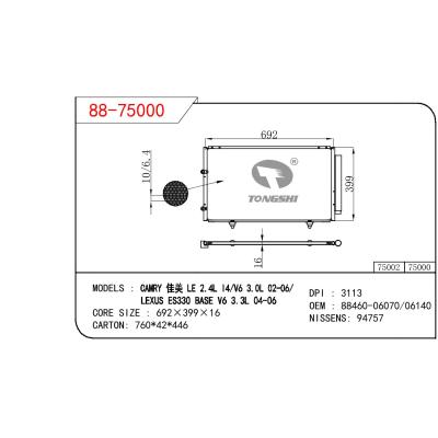 - 适用于丰田佳美 LE 2.4L I4/V6 3.0L 02-06/雷克萨斯 ES330 BASE V6 3.3L 04-06冷凝器 OEM : 88460-06070/06140