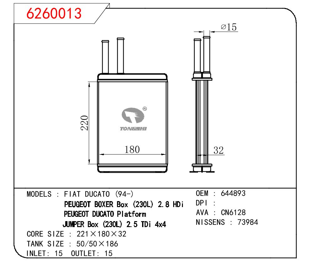 - 适用于FIAT FIAT DUCATO 94-/PEUGEOT BOXER BOX (230L) 2.8 HDI /PEUGEOT DUCATO PLATFORM /JUMPER BOX (230L) 2.5 TDI 4X4 OEM:644893