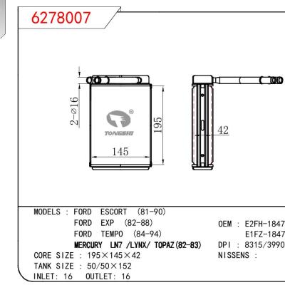 - 适用于福特福睿斯 (81-90)/福特EXP (82-88)/福特TEMPO (84-94)/水星LN7/LYNX/TOPAZ暖风 OEM :E2FH-18476-AA/E1FZ-18476-B