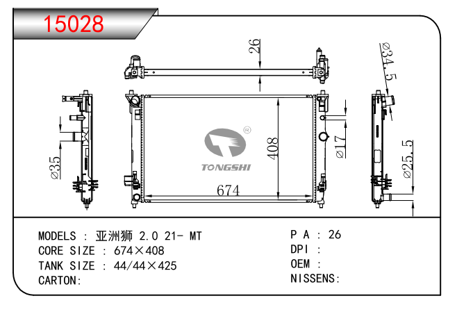 适用于亚洲狮 2.0 21- MT散热器