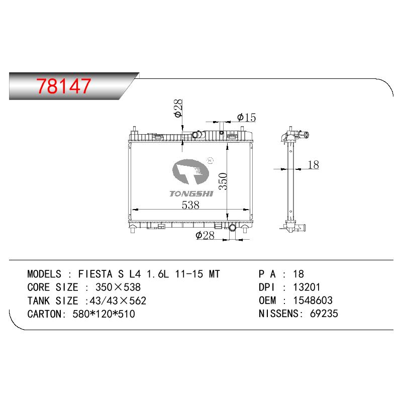- 适用于福特 嘉年华 S L4 1.6L 11-15 MT散热器 OEM : 1548603