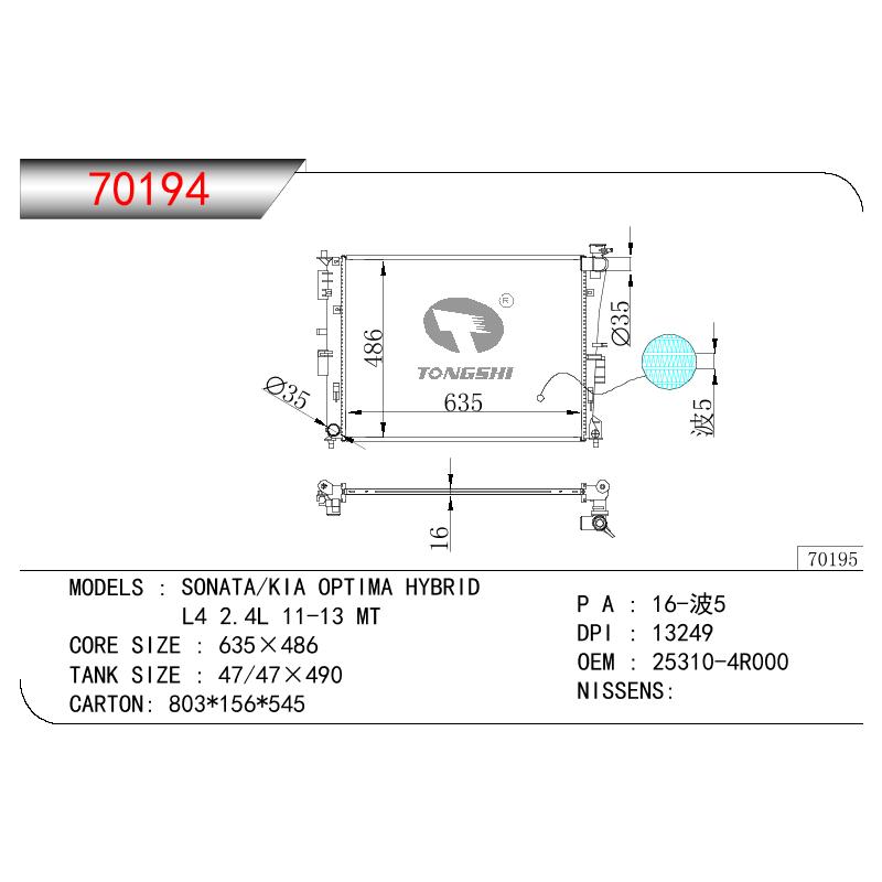 适用于HYUNDAI SONATA/KIA OPTIMA HYBRID L4 2.4L OEM:25310-4R000
