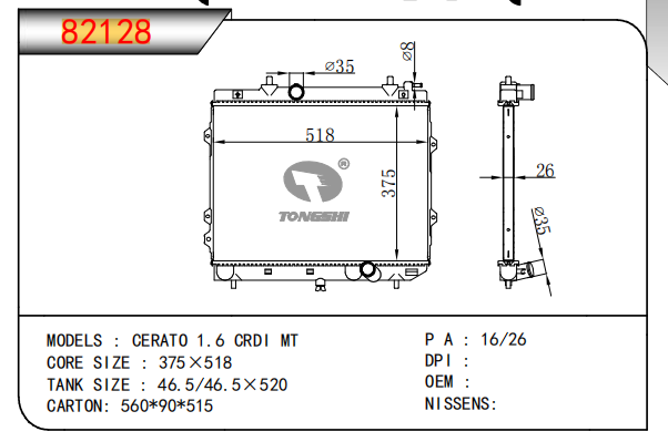 适用于起亚赛拉图 1.6 CRDI MT 散热器
