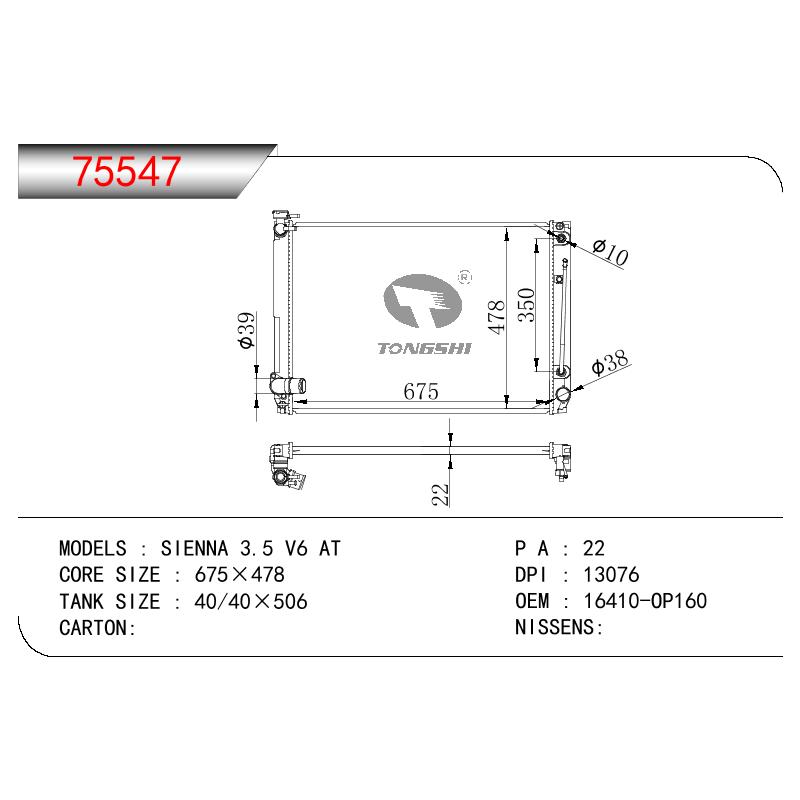 适用于丰田塞纳 3.5 V6 AT散热器 OEM : 16410-OP160