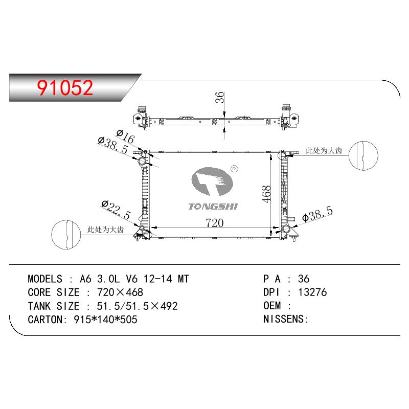 适用于奥迪 A6 3.0L V6 12-14 MT散热器