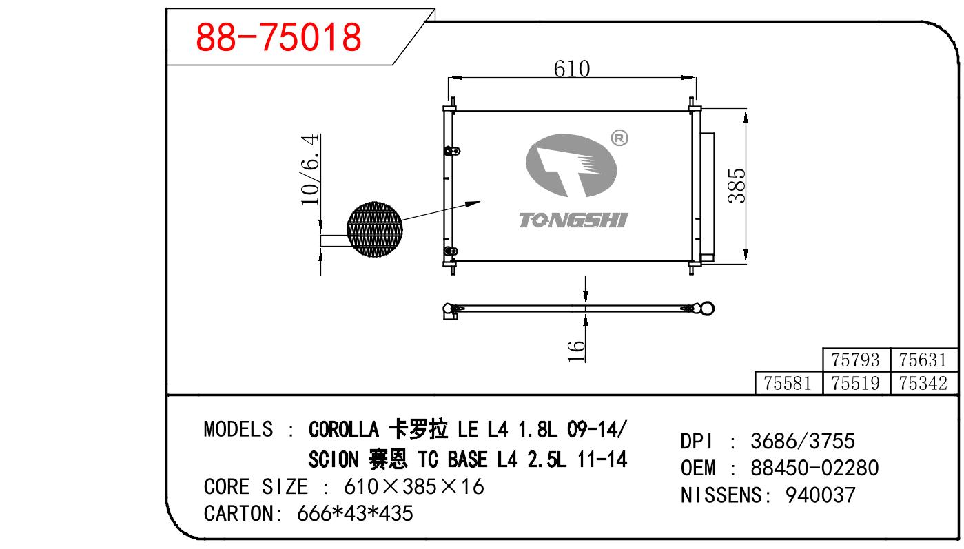 - 适用于丰田卡罗拉 LE L4 1.8L 09-14/赛德 TC BASE L4 2.5L 11-14冷凝器 OEM : 88450-02280