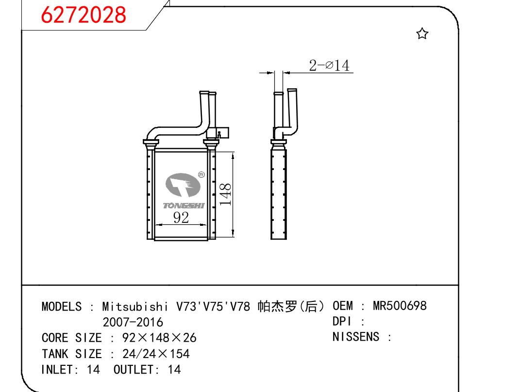 适用于三菱iV73'V75'V78 帕杰罗(后)2007-2016 暖风 OEM:MR500698