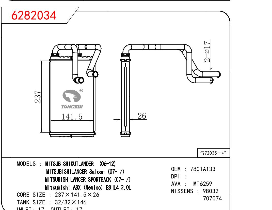 - 适用于三菱 OUTLANDER 06-12/LANCER SALOON 07-/LANCER SPORTBACK 07-/ASX (MEXICO) ES L4 2.0L 暖风 OEM:7801A133