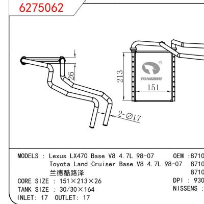 - 适用于适用丰田雷克萨斯LX470 Base V8 4.7L 98-07/ 兰德酷路泽Base V8 4.7L 98-07暖风 OEM :87107-60351/87107-60371/87107-60350