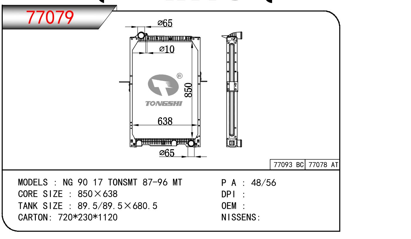 适用于奔驰 NG90 17 TONSMT 散热器 OEM:6525014901/6525016701