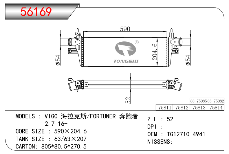 适用于丰田海拉克斯/奔跑者 2.7 16-中冷器 OEM:TG12710-4941